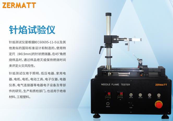 針焰測試儀是根據(jù)IEC60695-11-5以及其他類似的國際標準設(shè)計和制造的。使用特定尺 (Φ0.9mm)的針狀燃燒器,在45°角燃燒樣品時,通過樣品熄滅或保持燃燒時間來評定火災(zāi)風(fēng)險性。